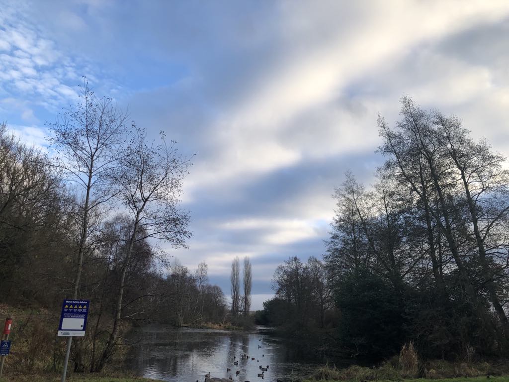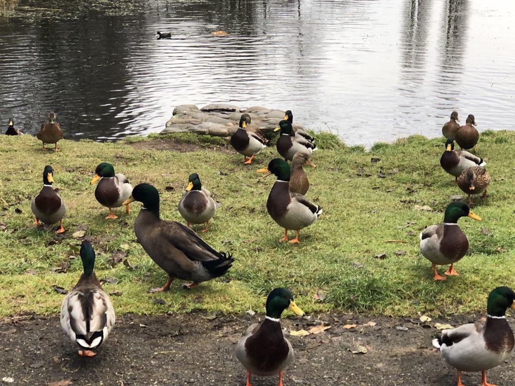ベンチに座ろうとしたら濡れていたので、こぐま氏が駐車場まで戻り車からタオルを取りに行った。その間、鴨たちがにぎやかに鳴きながらどんどん陸地に上がってきた。その様子を見ながらランチをしたが、体感温度は0度。動いていないと凍えそうなので、少し散歩をして公園を後にする。