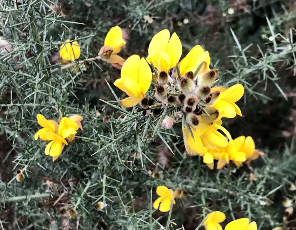 帰りは農場を通り、牛や羊の姿を確認。寒い中、ハリエニシダが黄色い花を咲かせていた。
