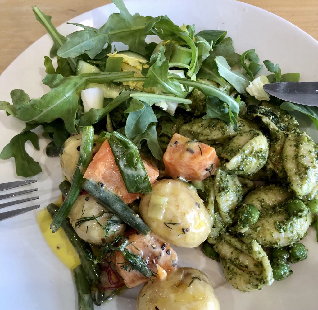 ナビに騙され30分以上遅れてSAに到着。二人はサンドイッチ、自分は三種類のサラダ盛り合わせにする。白菜や生のネギのぶつ切りが入っているのが珍しい。