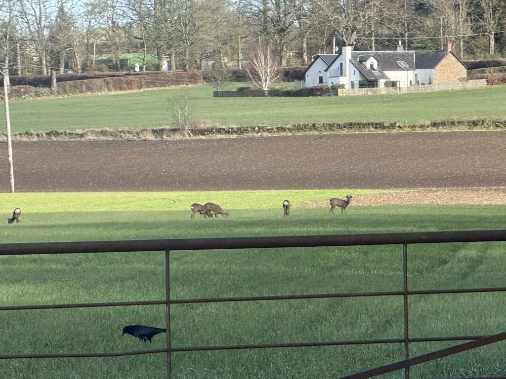 食後、散歩に出ようとするとご近所のBさんご夫妻にばったり会う。牧場の近くには鹿の家族が。牛たちは牛舎の扉の向こうでまったりとしていた。珍しくうさぎの姿も見かけた。