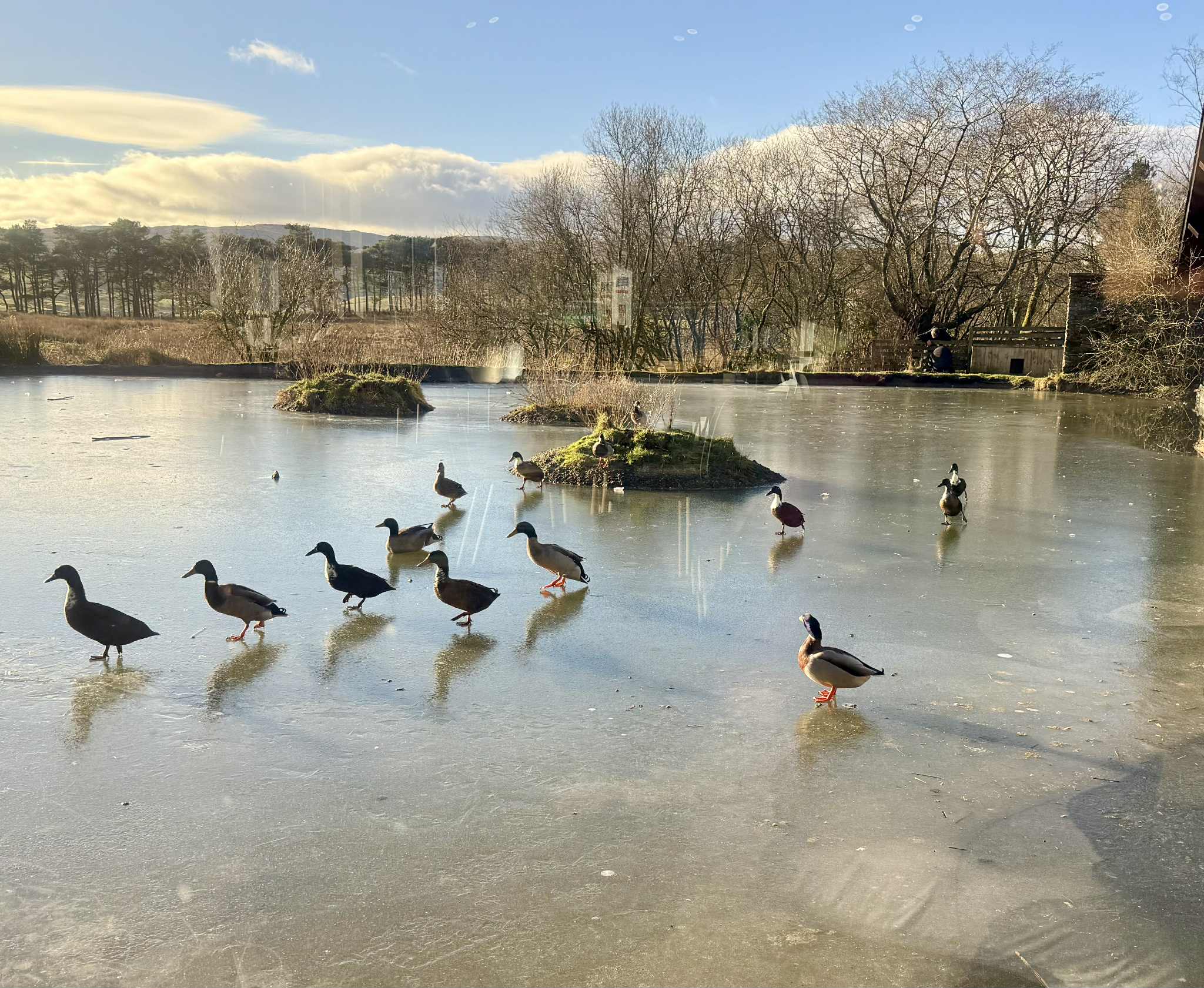 10:20頃出発し、天気もよく流れも順調。時折現れる羊や馬の姿を見ながらTebayサービスに到着。ランチにはまだ早いので、持ってきたバナナやみかんを食べて休憩。凍った池の上を鴨たちが歩いているのを眺めていた。ショップでブラウニーが割引(4.26ポンド)になっていたので購入する。