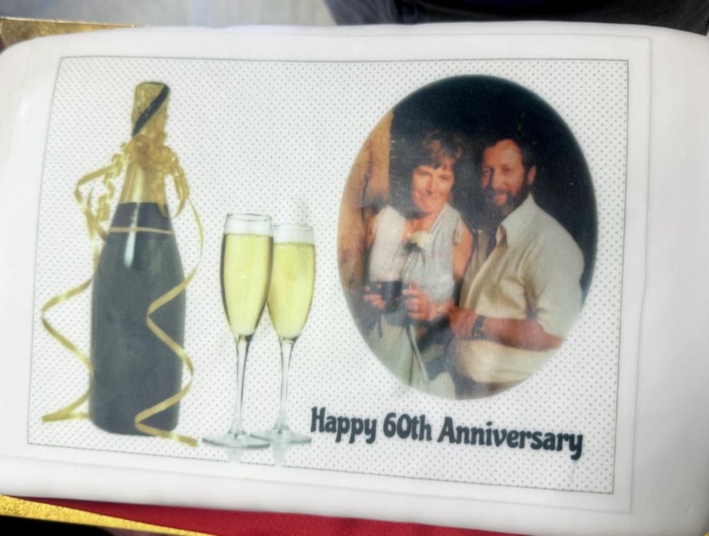 別のテーブルでは結婚60周年を迎えたカップルがお祝いされていて、ケーキとスパークリングワインのおすそ分けをいただく。晩婚だった我々には、不可能なお祝いである。