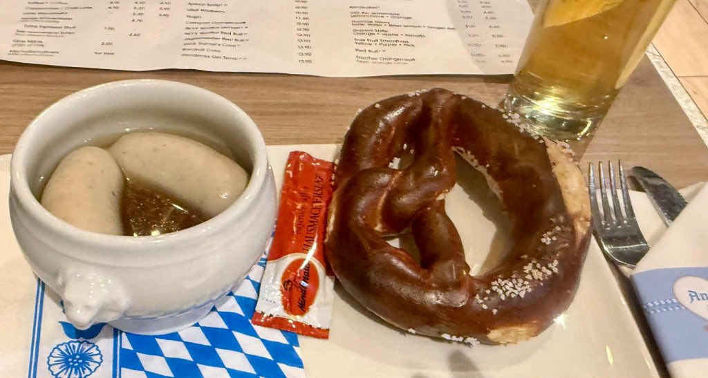 昼食を取りそびれたので、空港のカフェなどを覗く。ドイツならビールとソーセージだなと南ドイツ料理のレストランに入り、白ビール(7.7ユーロ)と白ソーセージ、プレッツェルのセット(11.5ユーロ)で計19.20ユーロ(約3,513円)を注文。