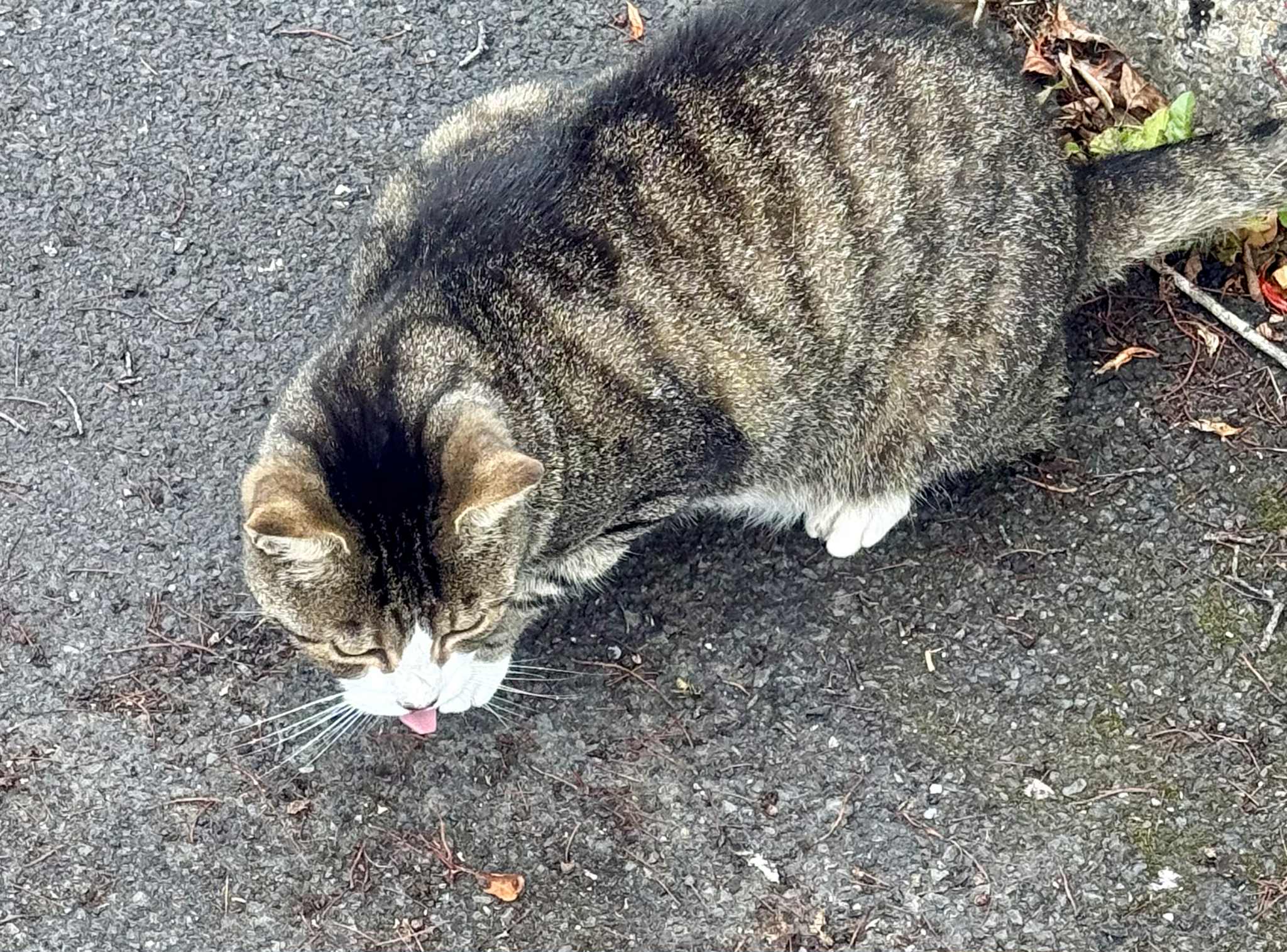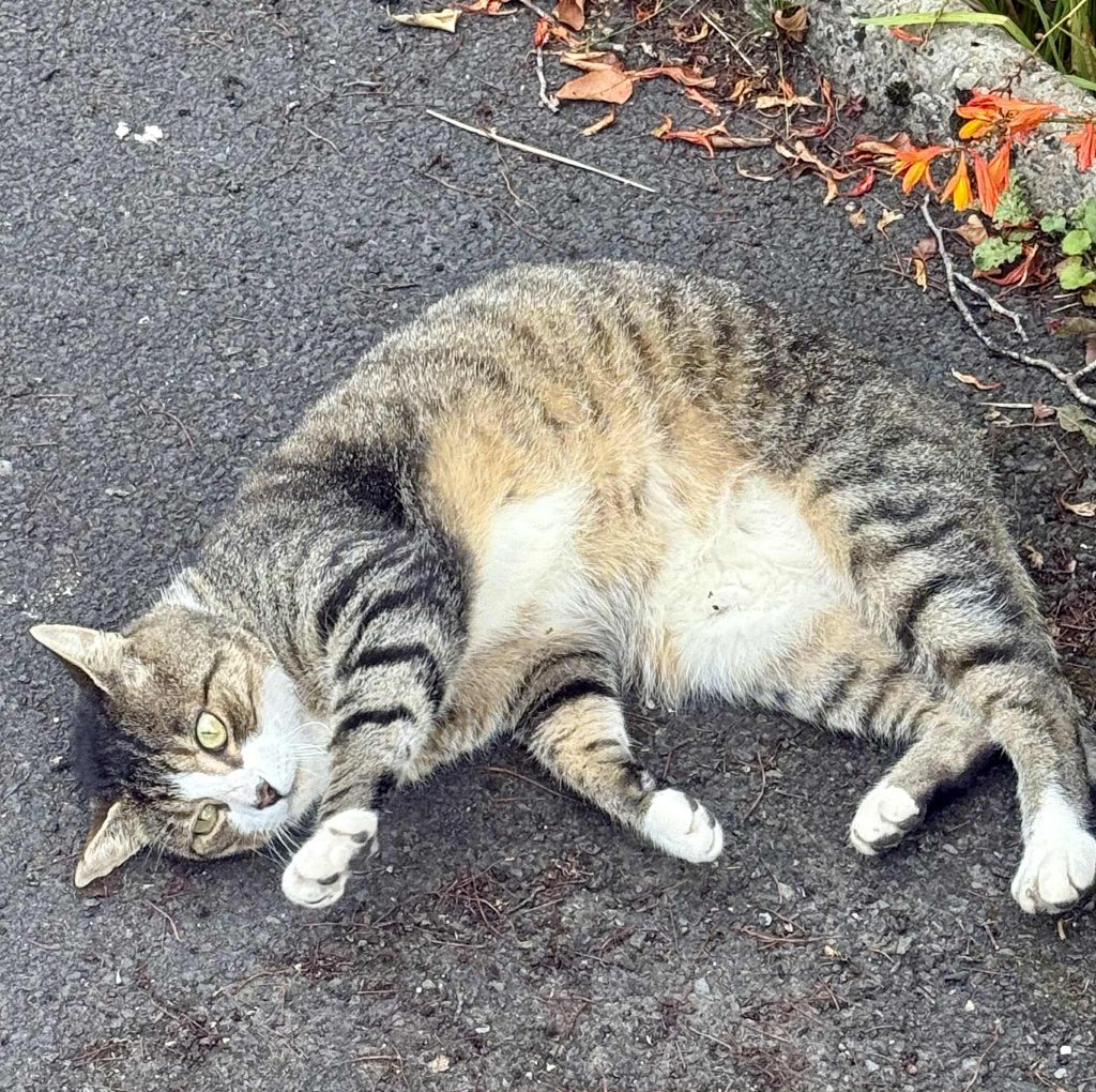 お義父さんが眠る墓地へ向かう途中、人懐こい猫に会う。鳴き真似をすると近寄ってきてなでさせてくれたが、その家の犬が室内から吠え出し、うちの猫に手を出すなと主張しているようだった。お墓に手を合わせて帰宅する。