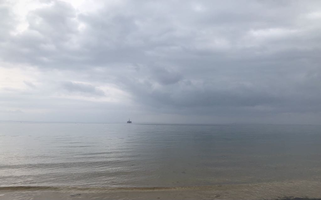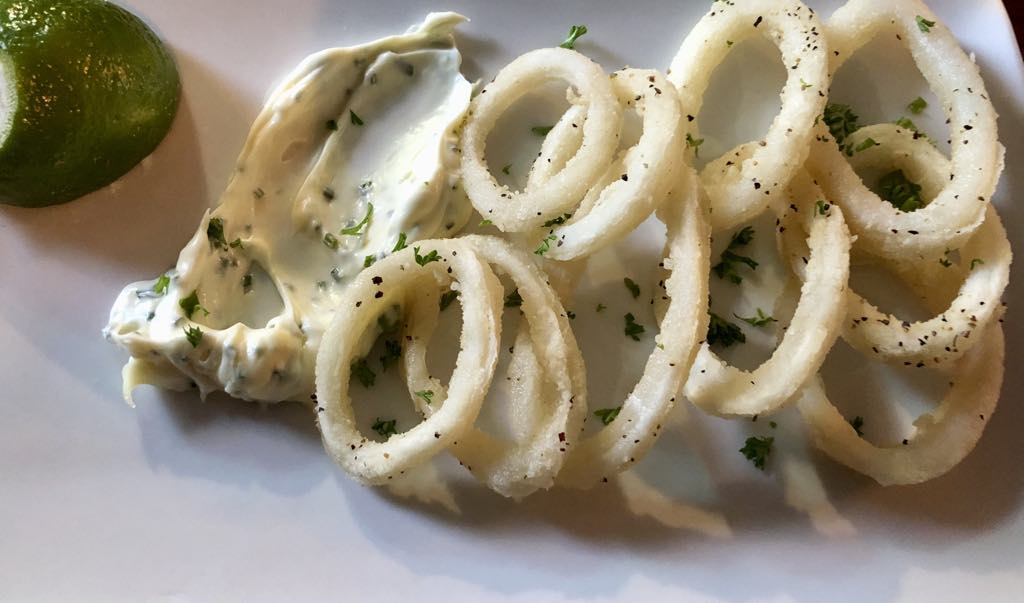 駐車場の近くのカフェは無休のはずが、行ってみると月火が休みで、ブティックや燻製のショップも休業日。海岸を歩いていたらテーブルセットが見えた。雰囲気がよさそうなので近づいて見るとホテル内のレストランだと分かり、そこでランチを取ることにする。それまで行った店は前菜だけでも十分なボリュームなところばかりだったので、当然それを想定してイカのフライを注文した。だが予想に反して、ほんのわずかな量で逆にびっくりする。