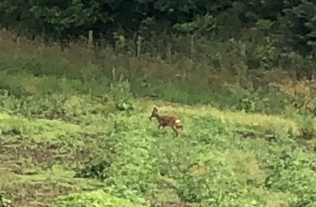 すると、ここのところ見かけていなかった1頭の鹿の姿が。森というよりは木の量が林という感じなので、身を隠せる場所はない。どこから来るのだろうかとと不思議に思う。民家に入るとバラや百合などを食べてしまうようでそれは困るが、やはり姿は愛らしい。