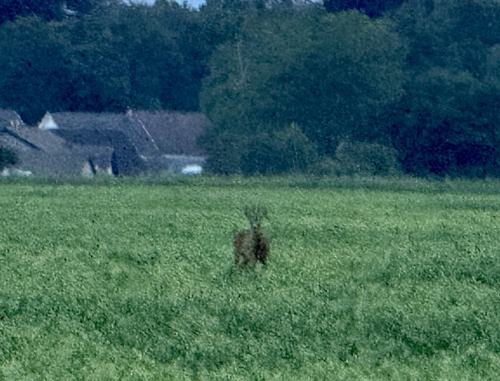 夕方、久しぶりに近所の農場付近を散歩する。家を出てすぐの路上の至近距離で鹿を目撃、白い斑点状の尻を見せて走り去った。