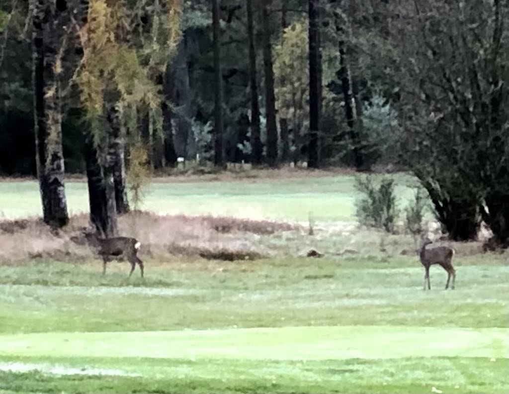 道はゴルフ場につながっており、人はいないがいくつかのホールのわきを通る。ゴルフ場の敷地を抜けようとするが、林の中の迷路のようでなかなか出られない。交通量の多い道路が近い音がするが、出口まで行きつかない。後どのくらいなのだろうと思っていたとき、3頭の鹿が飛び跳ねながら走り去っていくのを目撃する。