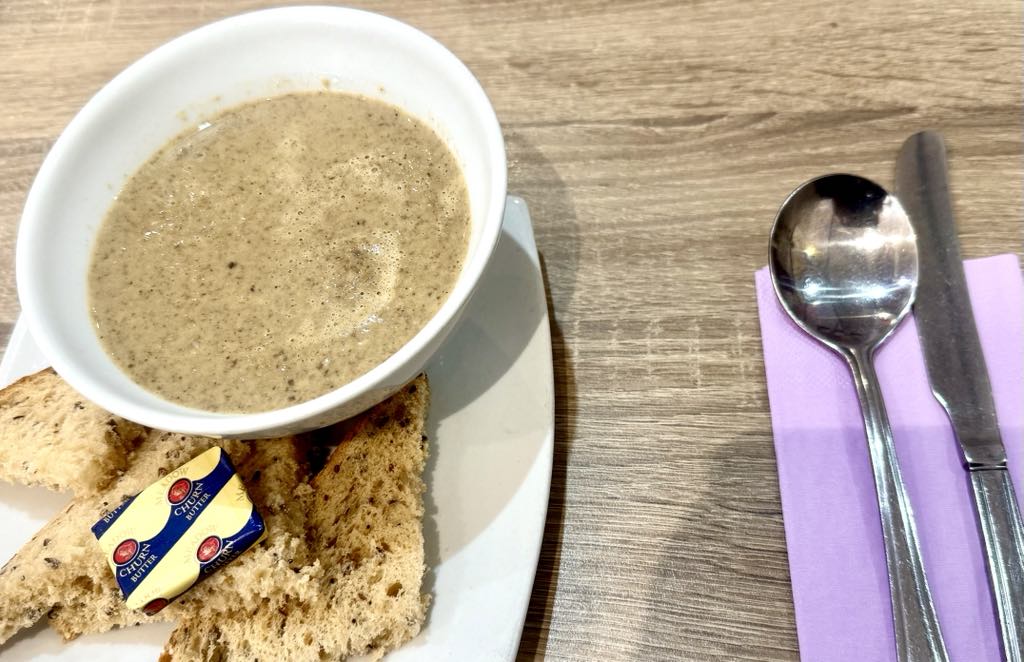 ランチは眼鏡店の近くのカフェに入り、マッシュルームのクリームスープとパン(4.5ポンド)を頼んだが、とてもおいしかった。